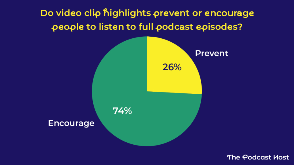 To see how creators feel about this trade-off, we ran a survey in our newsletter. 74% of indie podcasters said video clips encourage people to listen to full episodes. 26% believe clips can reduce long-form listening instead.