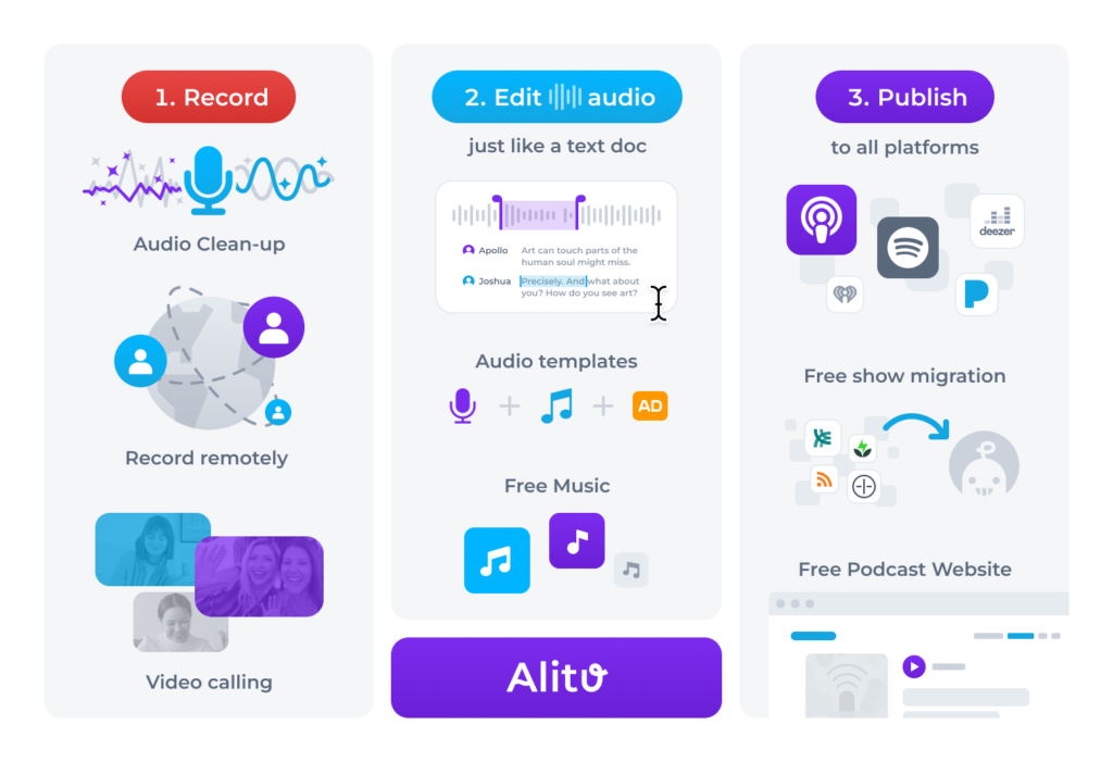 Alitu, for example, is a platform that does noise reduction, levelling, compression & EQ. It adds your music and transitions automatically. And it provides a really easy, podcast-specific audio editor so you can trim and remove mistakes, both with text-based-editing and traditional.