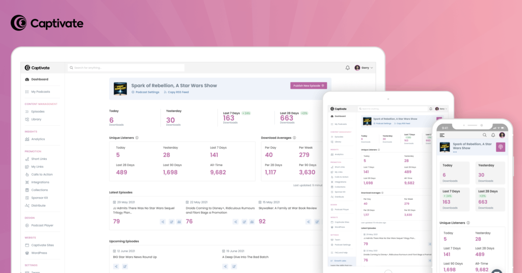 Captivate is a podcast hosting platform brought to you by the good folks who run Rebel Base Media and Podcast Websites. They know the podcasting space inside out, and this is reflected in Captivate’s look, features, and reputation as one of the best in the industry.