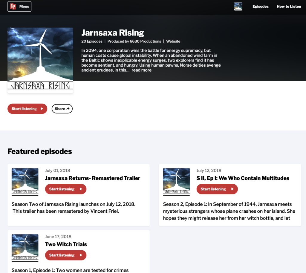 RadioPublic says, “episodes that are a “can’t miss” story, conversation, or interview, are free of back-references and inside jokes, and most importantly, leaves a listener hungry for more like it are ideal.” This is a good place to put your podcast trailer. So, the RSS feed brings your latest episodes to the directory layout, and, those selected episodes have links embedded up top.